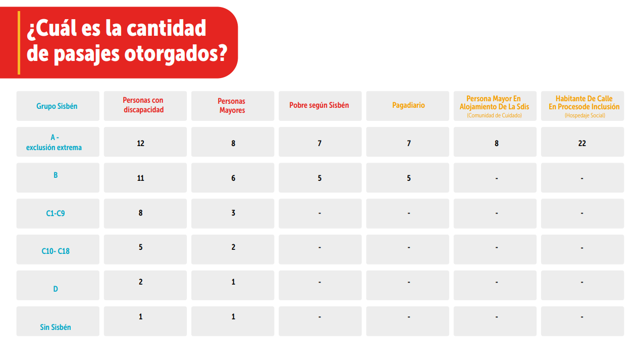 Actualmente, la cantidad de pasajes asignados depende de la tipología poblacional y de la clasificación en el SISBÉN de acuerdo con su categoría en el SISBÉN y los criterios de focalización vigentes.